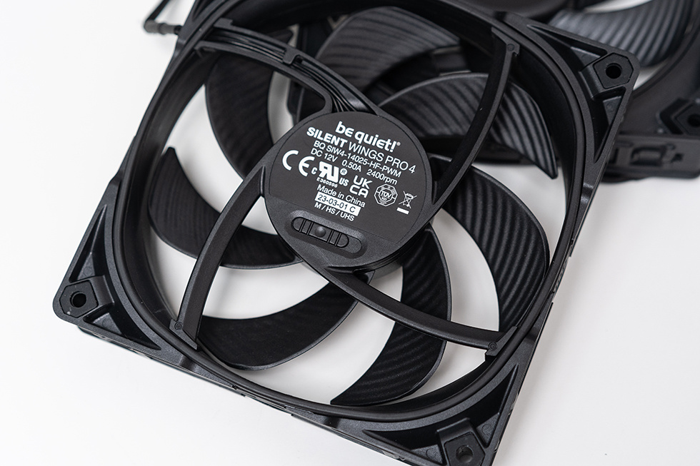 Silent Wings Pro 4 速度开关可迅速便捷在最大RPM等级的超高速、高速、中速之间切换转速。只需向右滑动开关即可实现多种用途。中速适合常规冷却性能下的各种操作。高速会加快转速,提供更强的冷却能力。超高速的冷却能力则足以满足高端电脑中高性能硬件的需求。