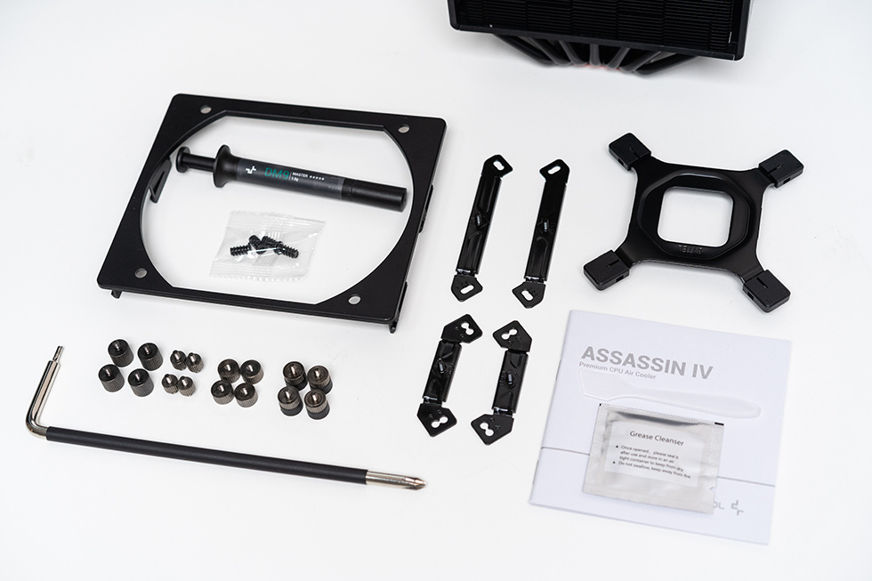 附件方面,阿萨辛4提供了Intel的LGA 1700/1200/115x/20xx以及AMD的AM4/AM5的安装扣具,同时附赠了一个弯角的内六角和十字螺丝刀,一根一分二的PMW分线器、一管九州风神的DM9散热硅脂、一包清洁纸巾和硅脂刮板。