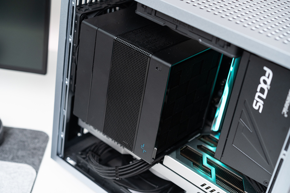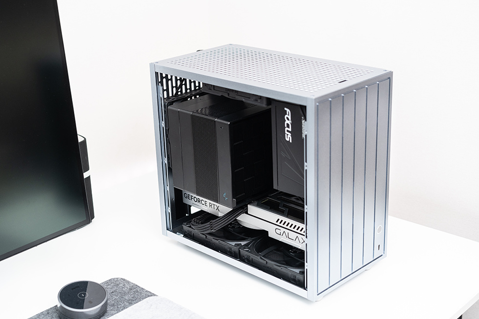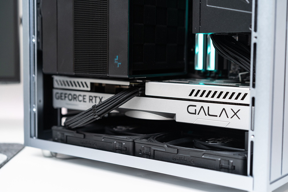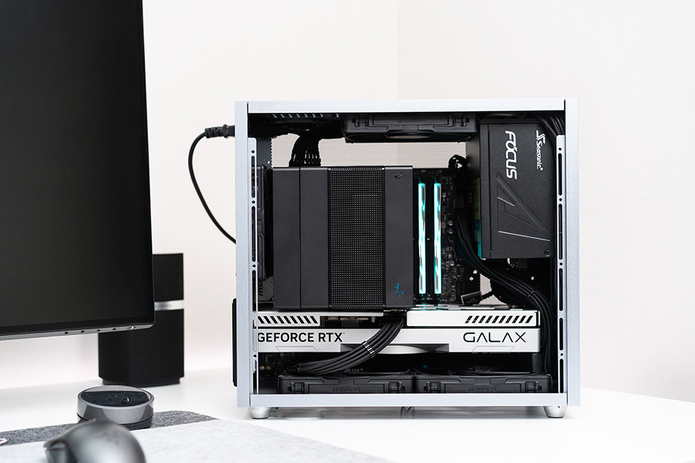 这次采用的是风冷,A6M最大支持165mm的塔式风冷散热器,阿萨辛4 164mm的高度刚刚正好,可谓严丝合缝。显卡使用的是影驰的金属大师4070,尺寸也是刚刚正好,最喜欢将内部空间全部塞满且又刚刚好的感觉。