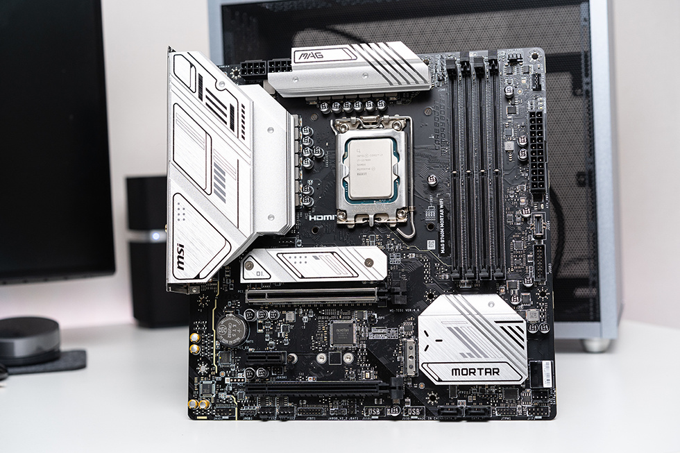 主板选用了微星 MAG B760M MORTAR WIFI,标准的MATX紧凑版型,基于Intel B760芯片组,采用6层2oz加厚铜PCB,主板的VRM(CPU供电区域),第一个SSD安装位,南桥芯片位置均覆盖了厚重的银白色铝制散热装甲,和底部黑色的PCB形成银黑配色。