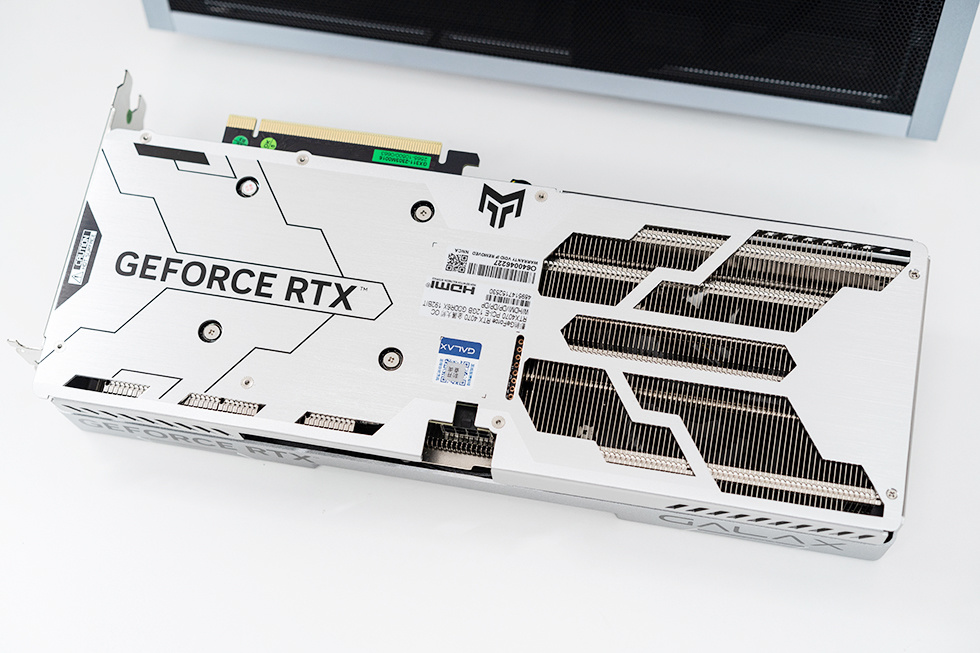 影驰RTX 4070金属大师显卡的为全金属的设计,背板中间的GEFORCE RTX logo和金属大师装饰纹,介于PCB版型短,右边则为大面积镂空散热设计,散热鳍片排布工整,有效增加散热效能。