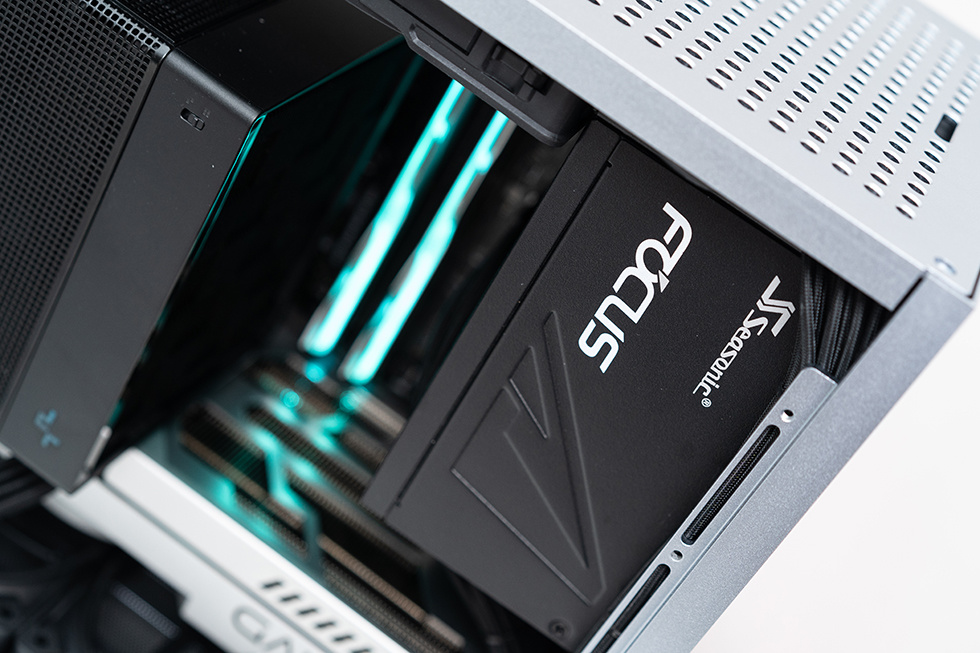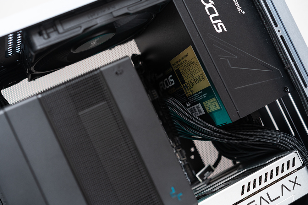 海韵 FOCUS GX1000W ATX 3.0,14cm的短小尺寸十分适合A6M的内部结构,吊装后底部留出充裕的走线空间。当然1000W的功率对于带动13700K+4070来说可谓的轻轻松松。