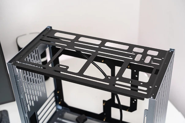 机箱底盖由四颗内六角螺丝固定,拆卸后可看到顶部的冷排、风扇电源多功能支架。顶部最大支持280规格冷排或2颗14cm风扇,还可以通过吊装实现SFX\SFX-L或ATX电源的安装。