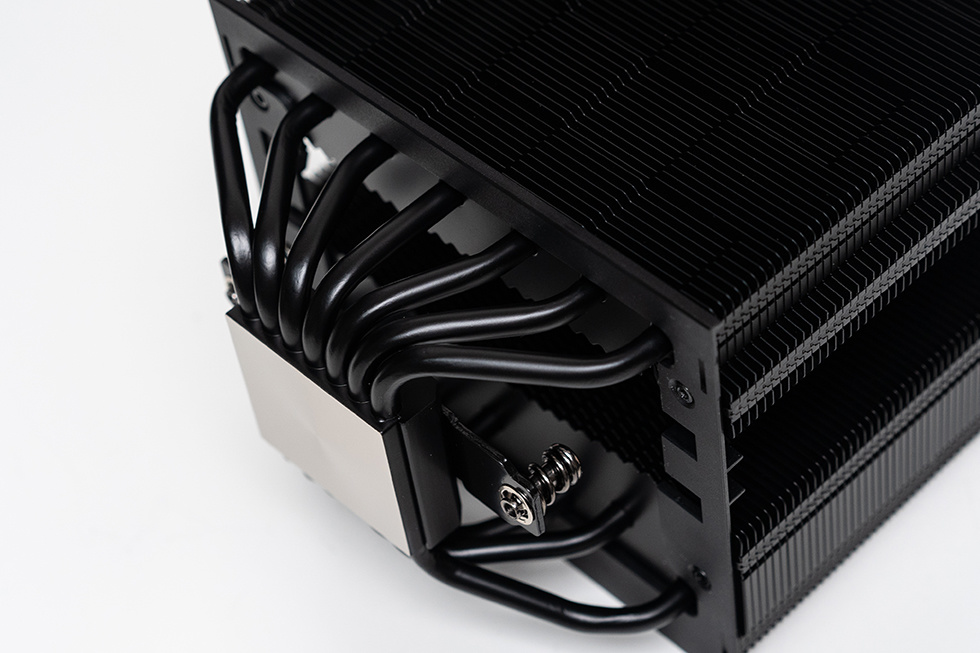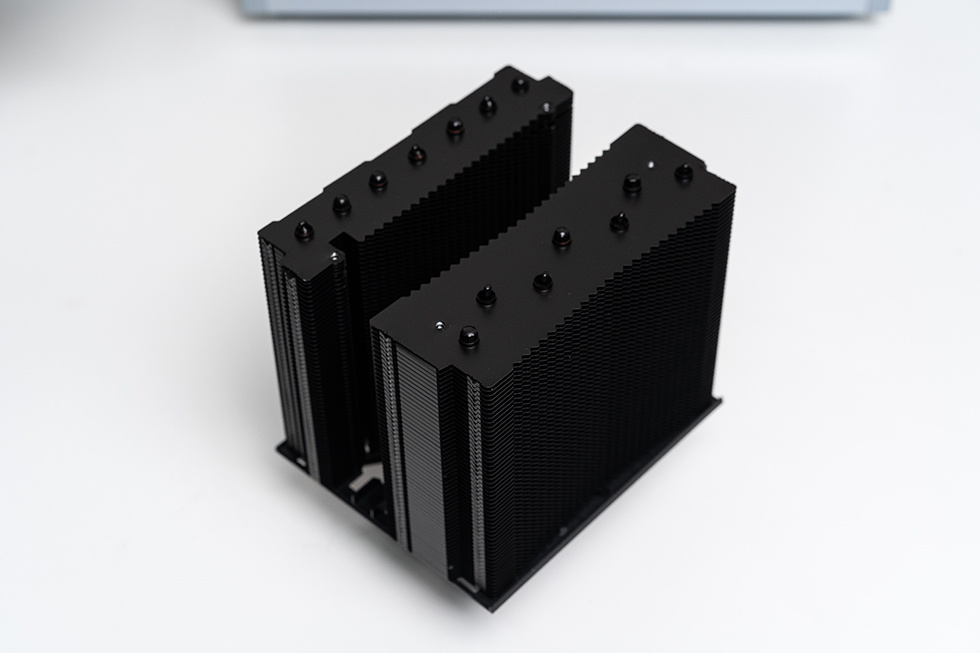阿萨辛4的主题采用非对称式塔体设计,铝制散热鳍片全黑化处理,鳍片采用穿FIN+折FIN工艺的鳍片安装方式,共有106片鳍片,约1139394m㎡有效散热面积。