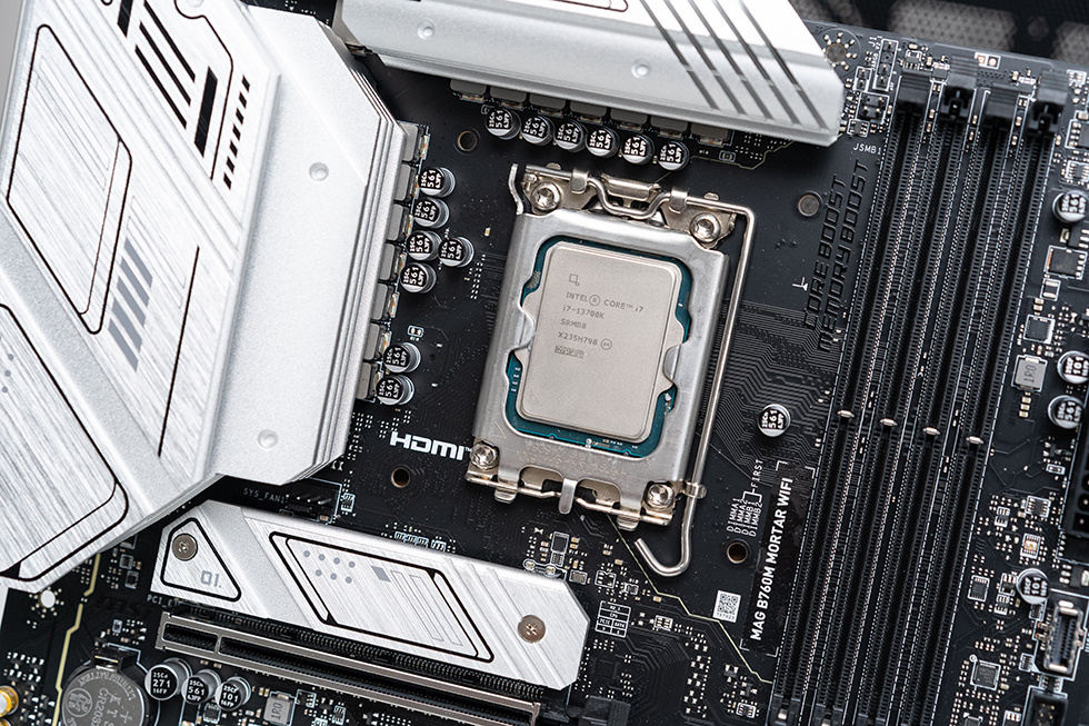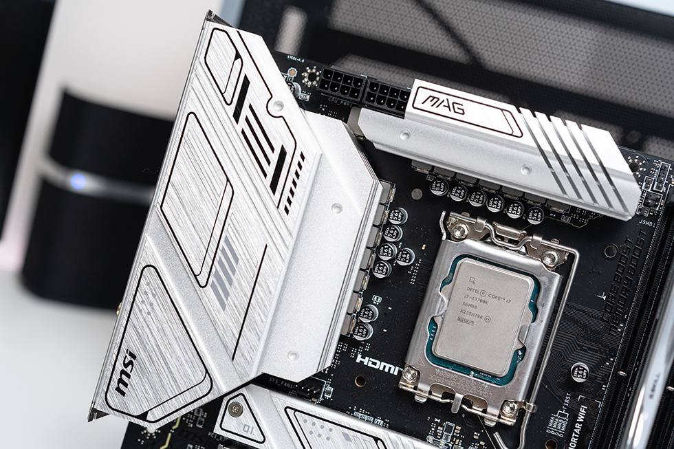 由于阿萨辛4 的巨大体型,主板位置基本被散热器主体覆盖,只能在顶部露出带有MAG标识的散热装甲可以看出使用的是微星 MAG B760M MORTAR WIFI主板。