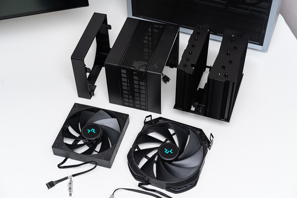 阿萨辛4采用了独特的14cm正叶+12cm反叶的风扇组合,双风扇搭载三相六极变频电机原厂FDB液态轴承,最高转速为1700RPM,两把风扇通过一分二线组合并联。同时还附赠了一个风扇支架,使用支架可额外加装上一个12cm风扇。