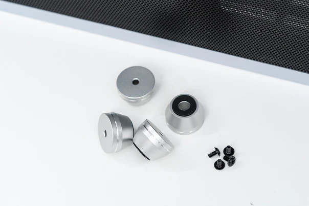 随机附带的4个CNC铝合金脚撑支持拆卸,锥形设计,表面喷砂+亮面开槽处理,底部带有橡胶防滑垫圈。