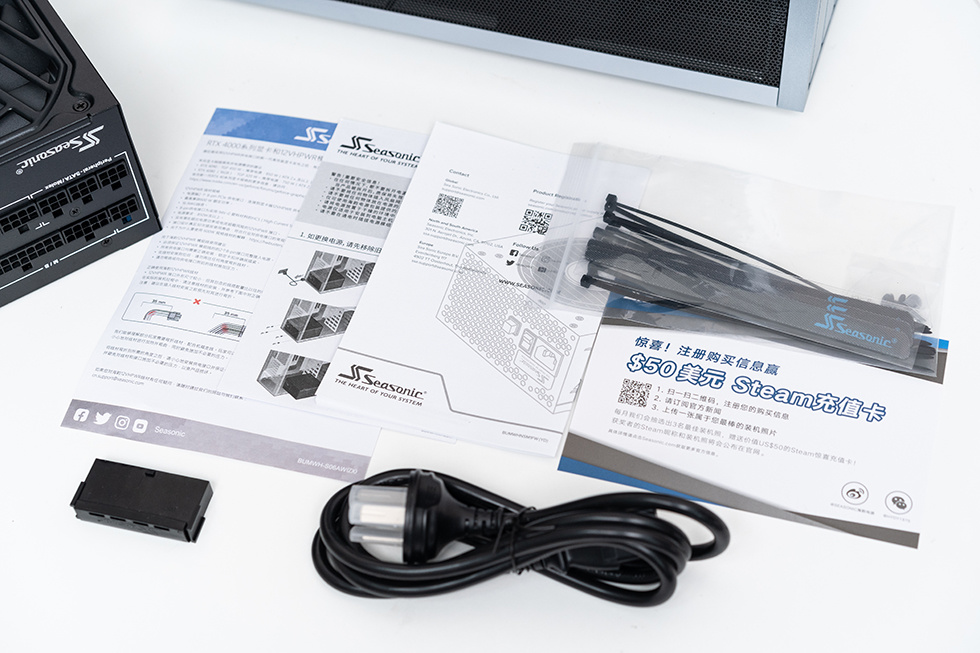 附件方面包含了说明书、使用手册、12VHPWR模组线使用建议、Steam抽奖充值卡、扎带、魔术扎带、电源安装螺丝、开机检测器、电源线。
