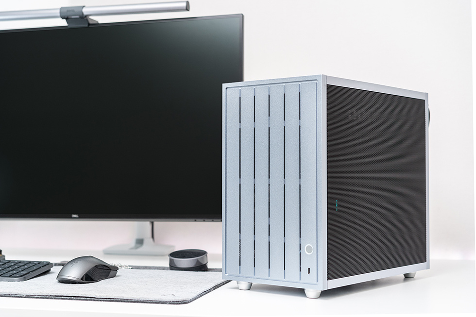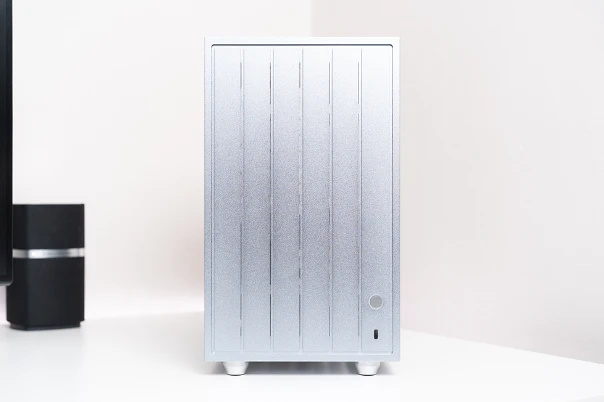 机箱的前面板为一整块铝板,通过CNC进行了条状分割处理,做了隐藏式的侧面竖形散热开孔设计,巧妙的实现散热通风和整体美观性需求统一。