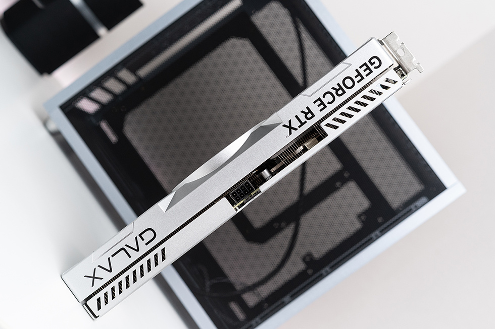 影驰RTX 4070金属大师长宽高尺寸为328*139*48mm,双槽厚度对于小机箱非常友好,可谓是ITX新的春。显卡顶部也带有斜纹散热开孔设计,并予以GEFORCE RTX logo和GALAX的LOGO字符装饰。