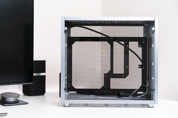 两侧的mesh面板是抽插形式安装的,如要取下侧板需要先将顶盖取下。