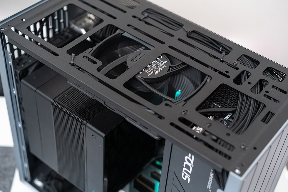 机箱顶部支持最大2个140mm风扇安装,考虑到内部的走线,我将电源吊装,这样使得顶部只能预留下1个14cm的空间,将其装安装在中央位置,和下方的形成对向风道。