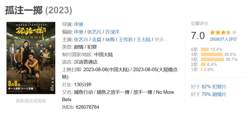 目前,《孤注一掷》在国内知名评分网站豆瓣上评分为7.0分,好于82%的犯罪片和79%的剧情片