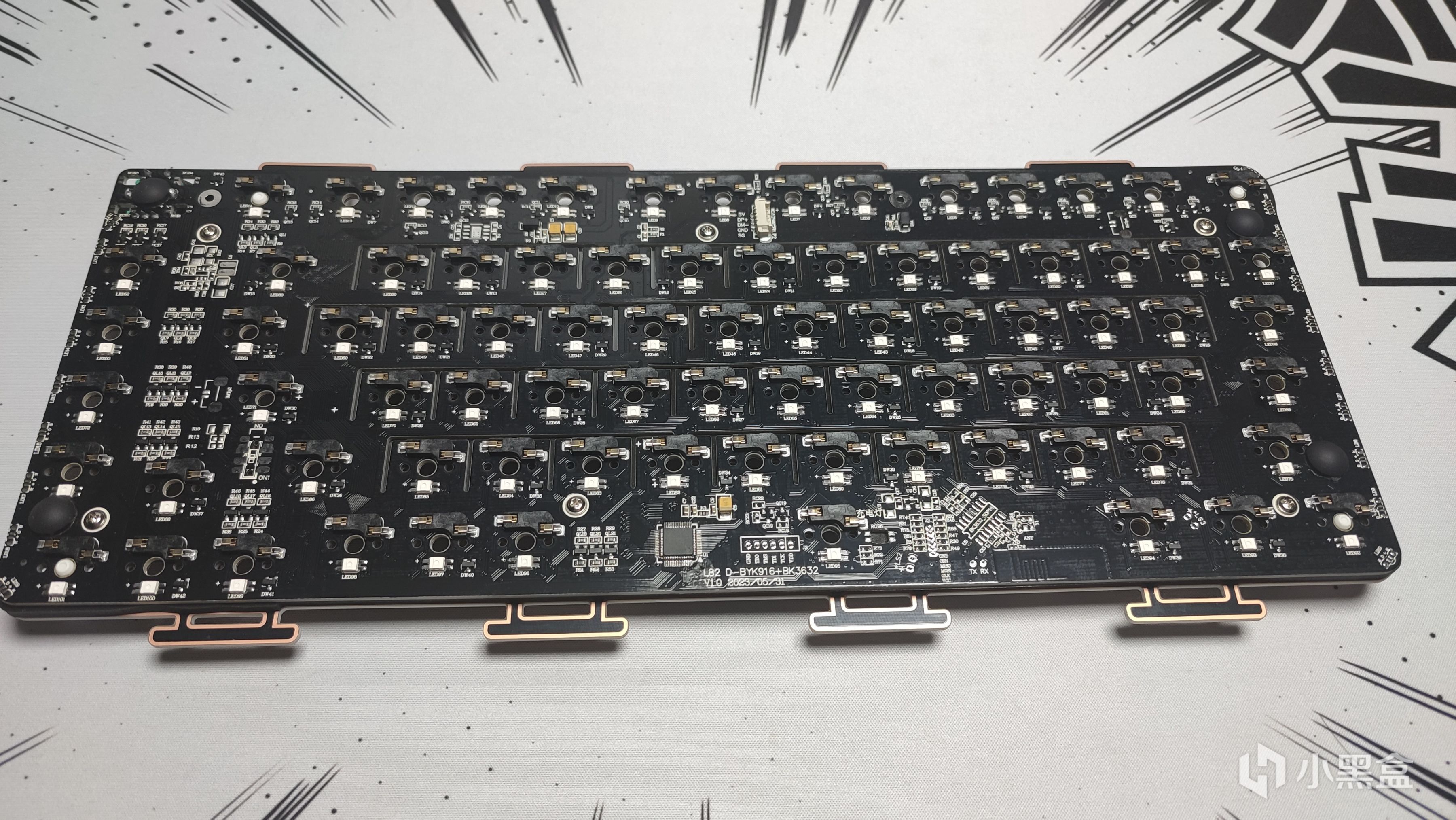 定位板採用的是FR4材質,之前可能在量產鍵盤中不常見,目前比較熱門的比如VGN S99以及狼蛛F99都已經開始用上FR4材質的定位板了。相較於PC材質,FR4材質產生的聲音會更脆。同時可以看到定位板上開槽的位置都增加了鍍銅,一方面能減少開槽帶來的不穩定性,另一方面也能減少經常插拔軸導致的磨損。