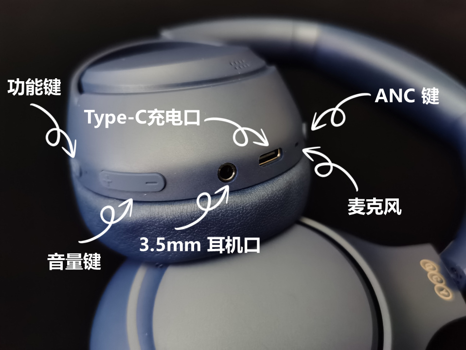 耳机的按键设计以人性化为出发点,所有按钮和接口都巧妙地设置在右侧下方,极大地方便了用户的使用体验。从左到右依次排列着功能键、音量键、3.5mm耳机口、Type-C充电口以及ANC键,这样的布局非常的合理,而按ANC键后就可以切换到通透模式,就可以和周围的小伙伴即时进行沟通,这个设计小细节充分考虑到了使用者的需求。