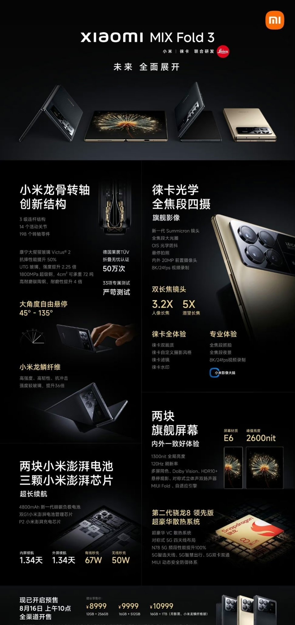今晚上小米发布了全新一代折叠屏小米MIX Fold3,配置汇总如下: