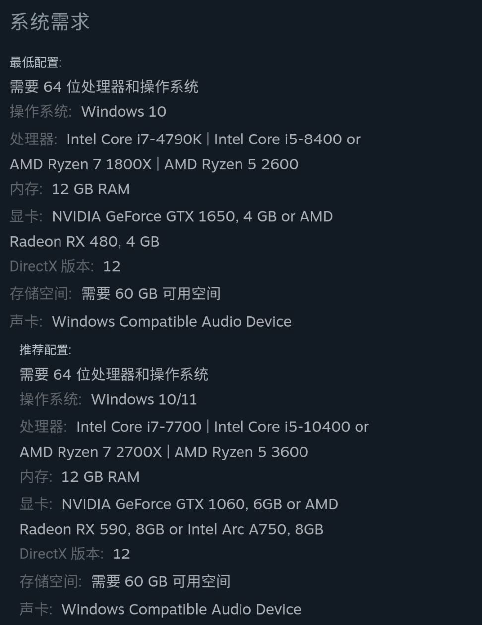 之前游戏只公布了最低配置,现如今公布了推荐配置,如图所示