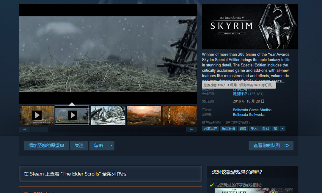 相信大家即使没玩过游戏,也多少耳闻过《上古卷轴5:天际》的诸多mod。作为一款老游戏,其玩家社区到现在仍维持着相当高的热度,大部分的功劳可以归功到游戏mod上。游戏为mod作者提供了发挥的平台,mod作者的创作又维持了游戏的生命力,可以说是互惠互利。游戏本身的口碑也是相当不错,steam上有13万以上的用户测评,好评率则达到了94%,是非常推荐入手的一款游戏。