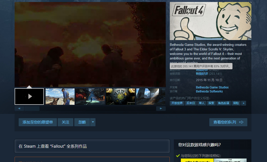 说起《辐射4》就不得不聊聊游戏衍生动画——避难所小子系列,动画主要内容是调侃核后的废土世界,其中的黑色幽默让人不禁会心一笑,另外动画也算是半个新手教程,玩家需要注意避难所小子的各种死法,以免相似的情况发生在自己身上。本身的口碑还算可以,steam超过20万的用户测评、83%的好评率,总体来说值得一试。