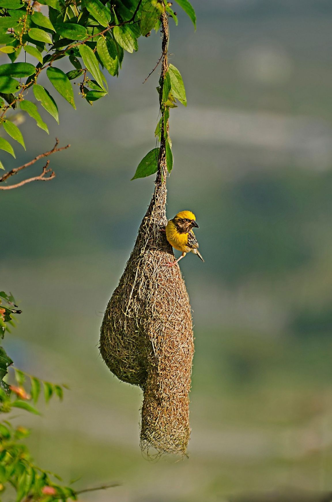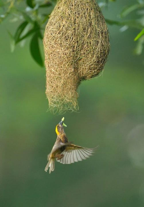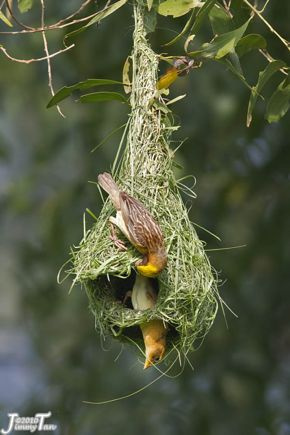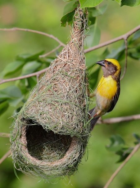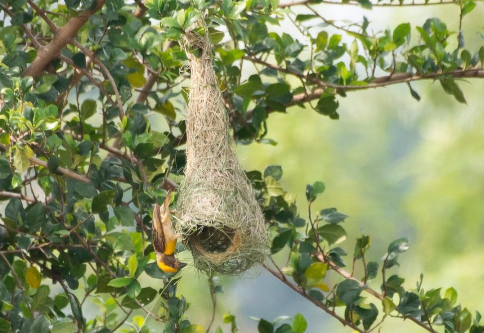 巢也有雌雄之分,雄性的巢形狀像一個懸掛的麻袋,底部是大敞的口。雌性的巢底部密封做成窩狀,供孵化育雛。