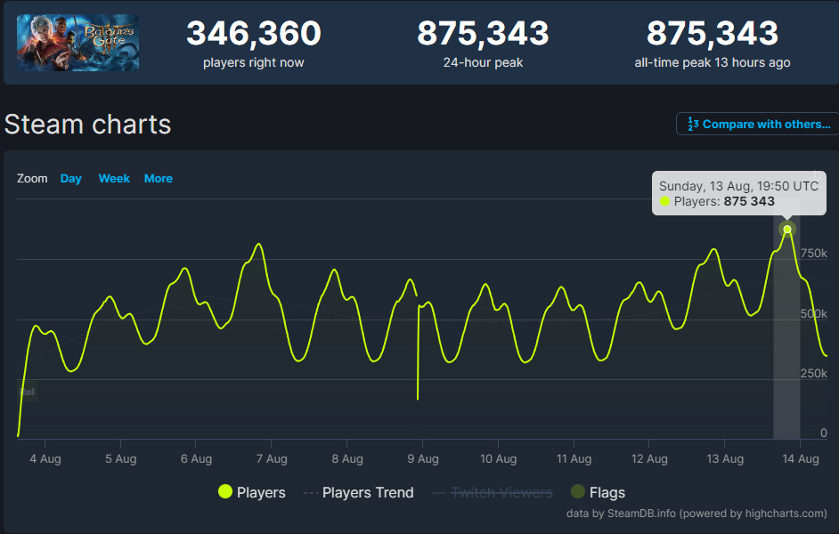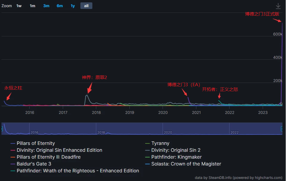 每日在线玩家数峰值,在《博德之门3》面前,其他同类游戏只能仰视(数据来源SteamDB)