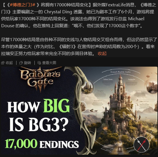 另外就是向玩家们宣传游戏内充满变化的结局。经验丰富的玩家会「自觉地」给17000这个看起来好像很夸张的数字以2为底取个对数:就算影响结局的支线选项都分别只有两种结果,也只需要14个就能达到这个数量(其实这个数量也挺多了)。显然拉瑞安在此的目的是让《博德之门3》吸引习惯了被线性剧情推着走的玩家:不管他们是不是真的喜欢按照固定的剧本玩游戏,能决定剧情走向的游戏肯定仍然非常具有吸引力。