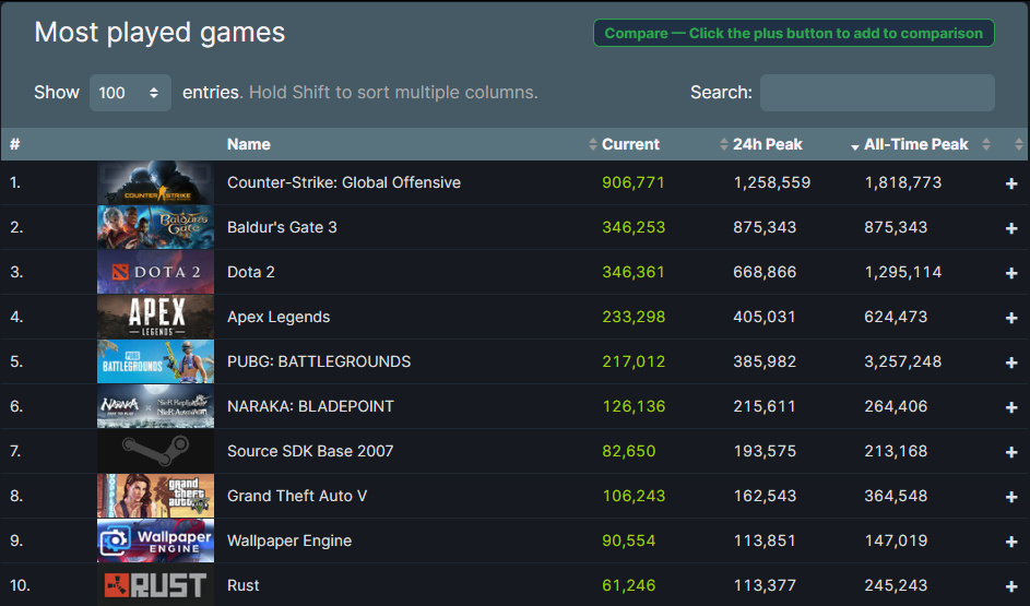 《博德之门3》的表现显然可以用「破圈」来形容,它的日在线玩家数峰值达到了Steam实时排行榜的第二名、历史排行榜的前十名——一个公认是小众类型的游戏在一堆多人射击游戏中杀出了重围。
