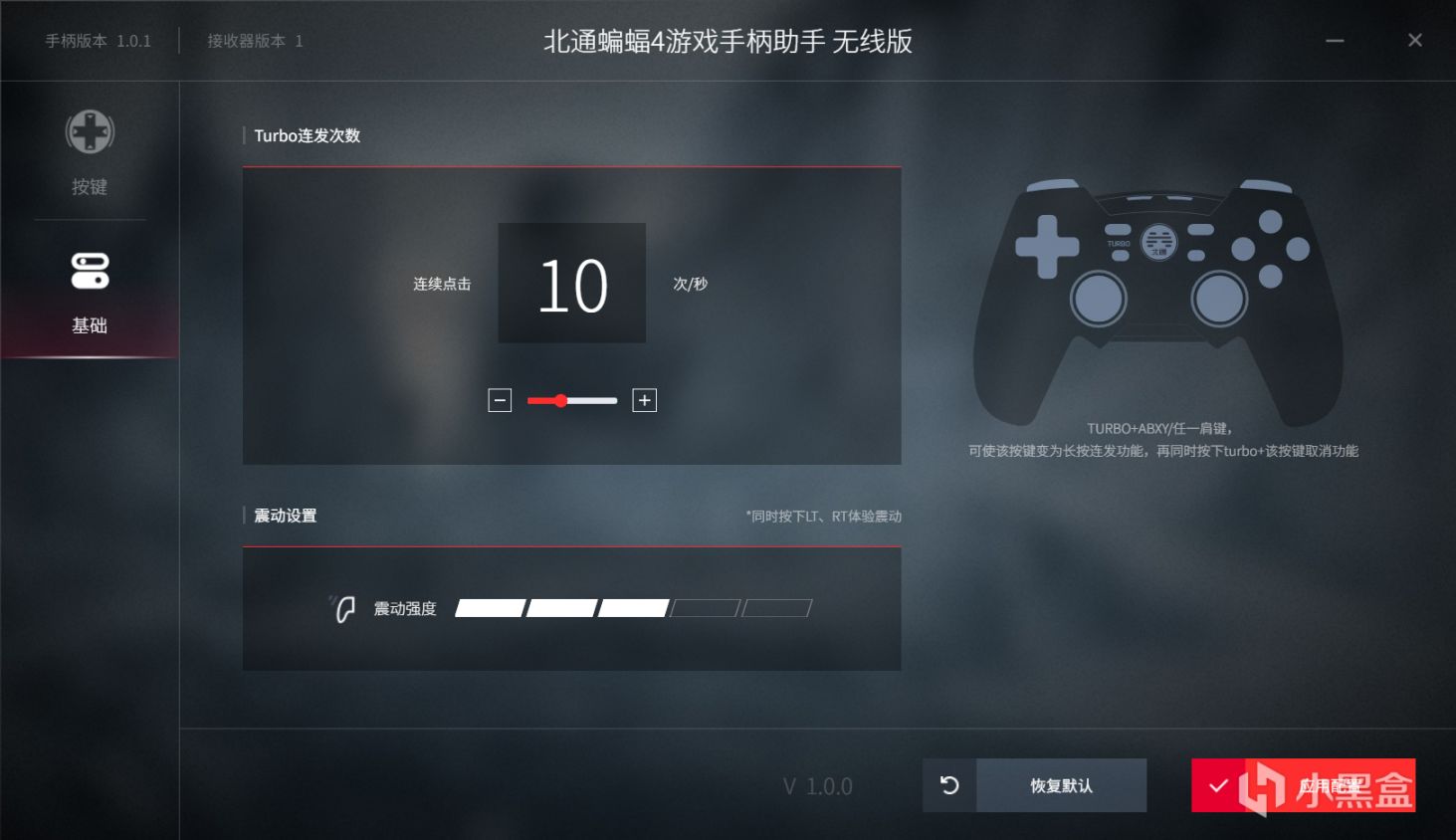 四周除了常見的菜單和返回鍵,還多了兩顆按鍵,這就是蝙蝠特有的按鍵了。左側的Turbo按鍵可以將按鍵轉爲連發,比如TURBO+X,手柄震動過後再去長按X鍵就會看到從長按變爲連發,具體可以參考下圖: