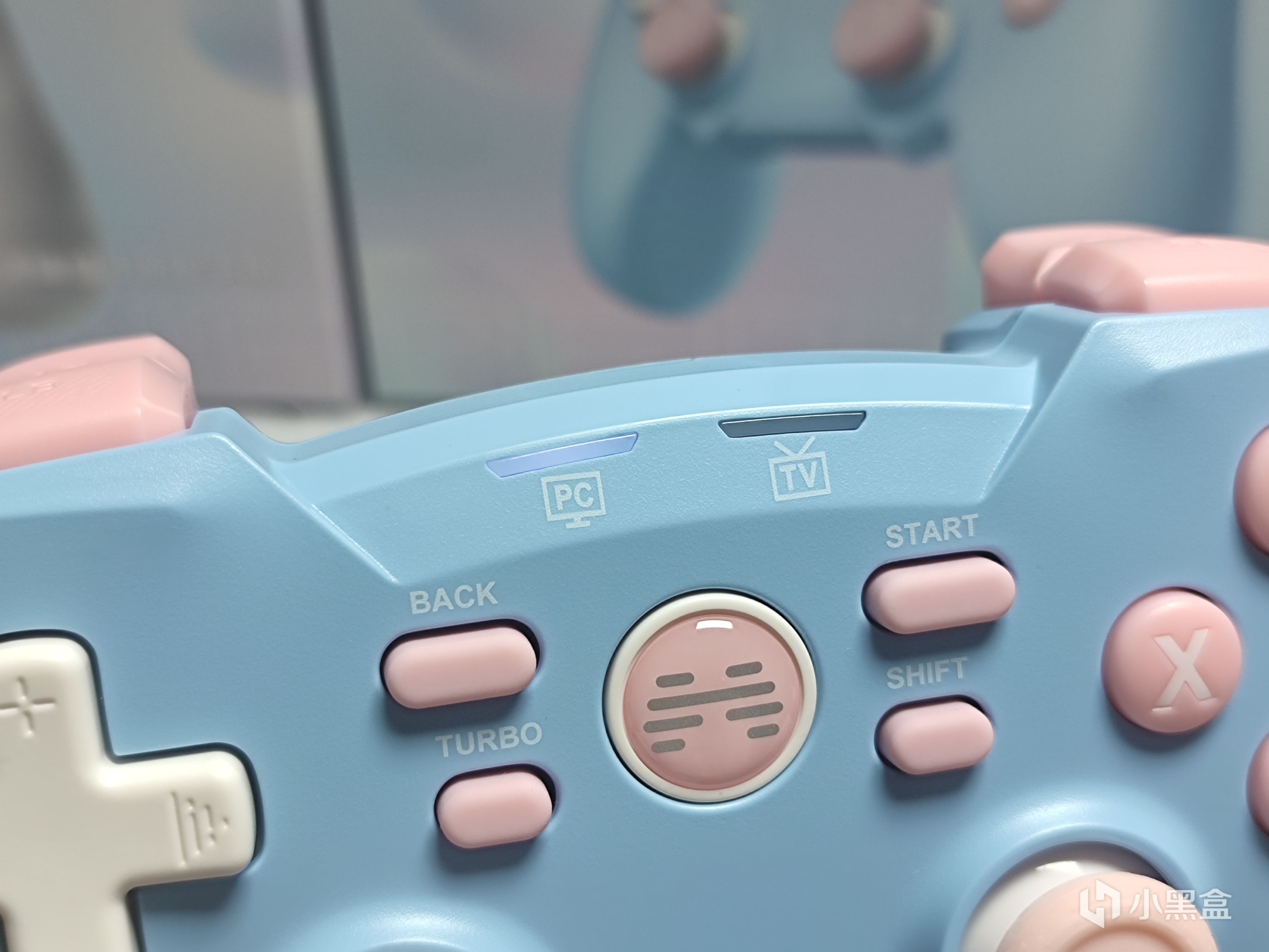 上方就是指示燈的位置,可以看到除了玩家們常用的PC外,這款手柄還支持TV模式,即使你想要回味童年,在電視上玩拳皇等遊戲這款手柄也能輕鬆應對。此外這兩個指示燈還可以用來觀察電量,不用擔心玩着玩着突然沒電。