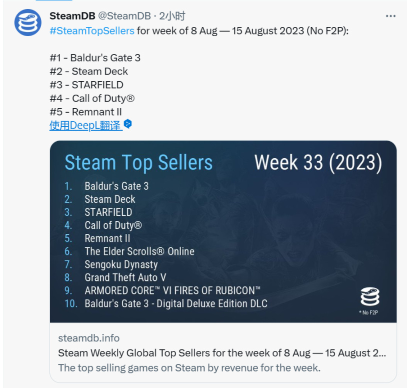一句话概括就是:《博德之门3》稳定王座(还是双杀!),Steam Deck发挥稳定,即将发售的《星空》和《装甲核心6》开始发力!那个男人,还在榜上!!!