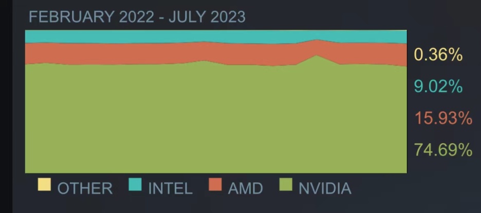 以上就是7月Steam用户显卡占比率前十名,十款显卡均为NVIDIA旗下品牌,AMD系列显卡占比率相对较低只有15.93%,唯有RX580相对突出为例23名。NVIDIA占比率高达74.69%,4款10系显卡依旧老当益壮位列榜单,你的显卡上榜了吗?你觉得10系显卡还能战多久,欢迎评论区探讨。
