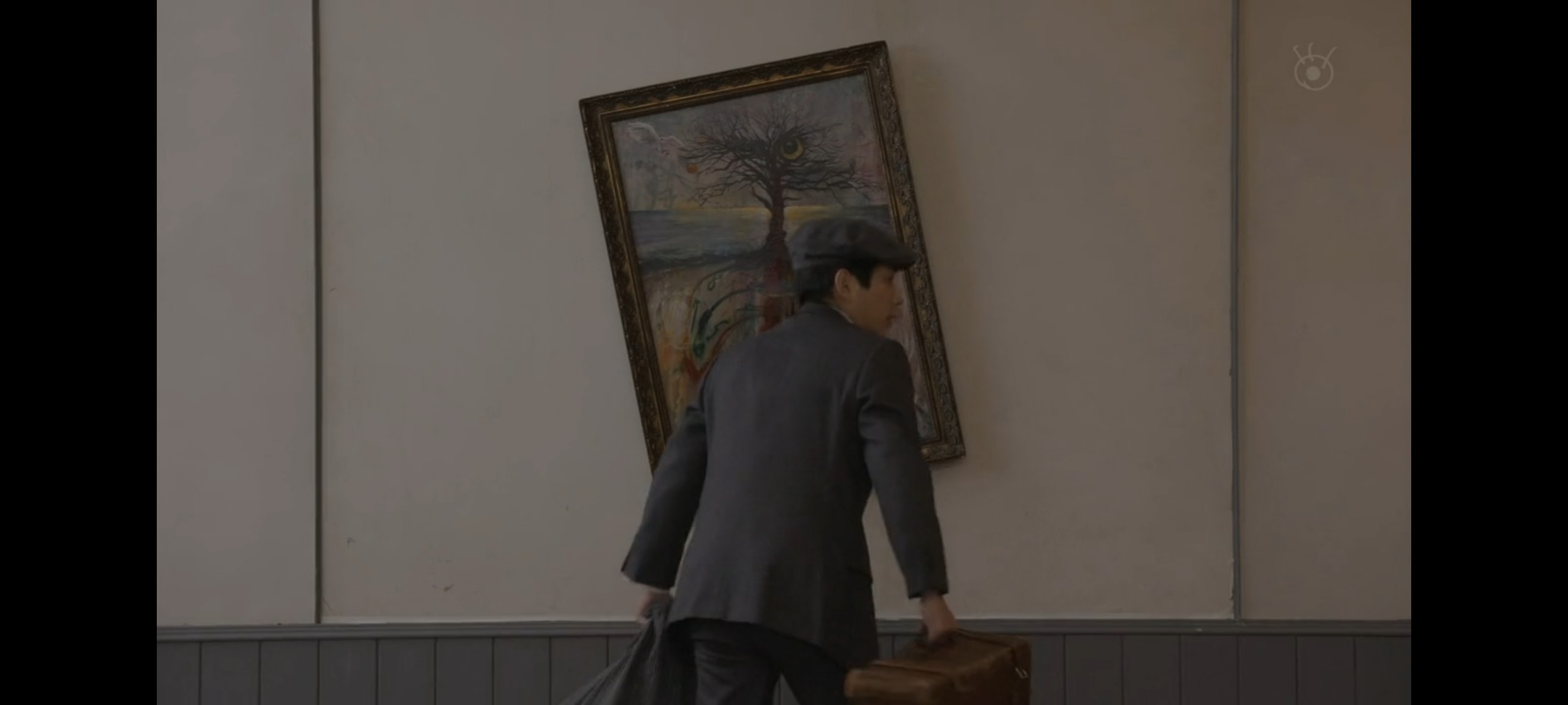 少爷乘坐人力车来到了中学,一进门便发现教导主任那幅莫名其妙的画,为了让它看起来正常点,少爷把画歪着摆了。