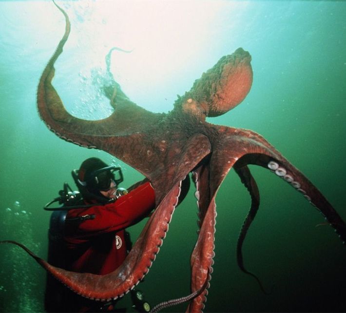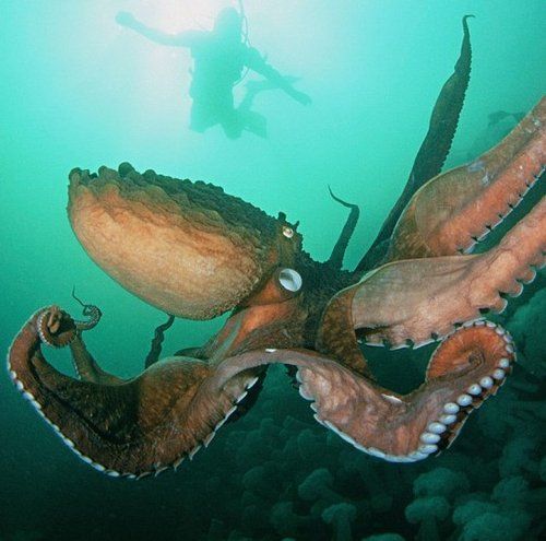 它在其他方面與人很不相同:章魚有三個心臟,兩個記憶系統(一個是大腦記憶系統,另一個記憶系統則直接與吸盤相連),一些非常敏感的化學的和觸覺的感受器。章魚的大腦中有5億個神經元,具有一種非凡的思維方式(人類還遠未弄清楚這種思維方式)。章魚能夠獨自解決複雜的問題,即具有所謂的“概念智力”。自從30多年前庫斯托研究小組進行了首批試驗以來(在當時的試驗中,一隻章魚打開了一個用瓶塞塞住的廣口瓶,抓住了放在瓶中的一隻龍蝦),章魚不斷地令科學家們感到驚訝,有時甚至使科學家們感到不安。有人斷言:潛伏的章魚正等待着自己的統治時期的到來。
