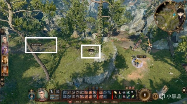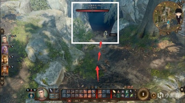 接着往西走,遇到石桥直接往右下走过水面就会发现枭熊洞穴。来到洞穴门口会发现两个NPC在等我们,与他们对话后进入洞穴