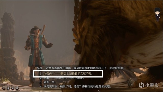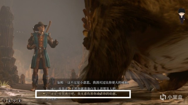 这里推荐一个游说或威吓较高队友先脱离队伍,上前触发剧情,选择游说或威吓选项投骰子,成功后这样枭熊妈妈就不会理会我们了
