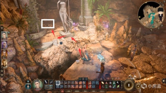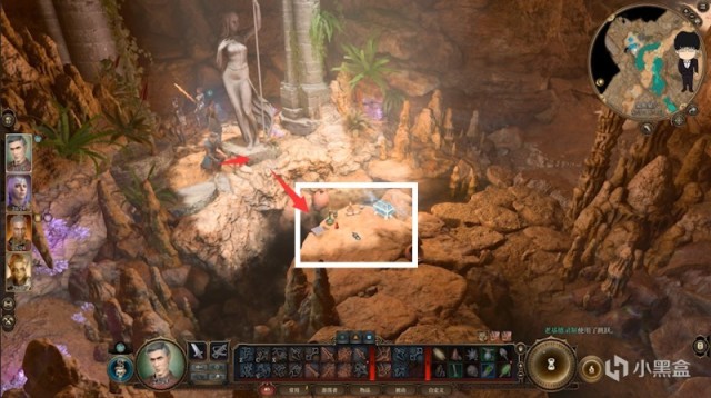 绕到前面深处往下会发现一个塞伦涅的神龛,发光的箱子先不要触碰,先跳到对面的石像处
