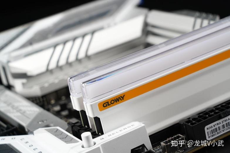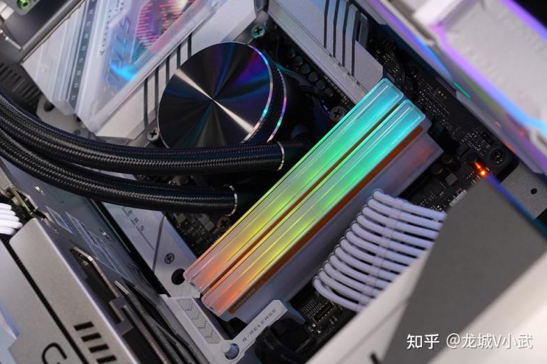 內存上機效果,內存頂部採用了高透的亞克力材質結合導光條設計,內置1680萬色 ARGB燈珠,支持各類主板廠的燈效控制,可以實現神光同步。