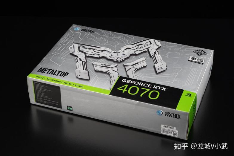 顯卡使用的是影馳的 GeForce RTX 4070金屬大師,新的40系金屬大師顯卡包裝對比上代纖薄了不少,外觀上依然延續了金屬大師系列機械裝甲風格的設計,亮銀配色透着濃濃的金屬質感。