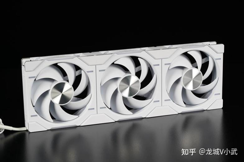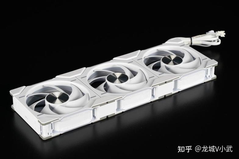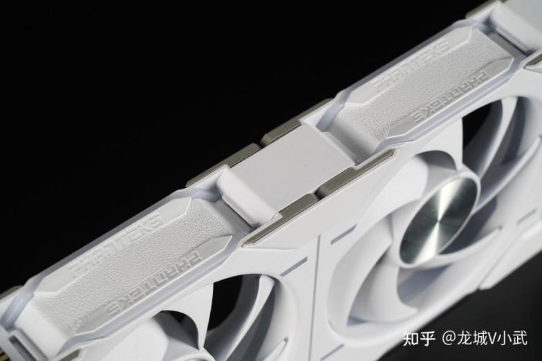 黑框白扇葉,扇葉沒有 RGB 燈效,只有邊框和正面邊緣具備 ARGB 燈效,採用較寬的扇葉設計,帶來更好的散熱性能。風扇正面中心同心圓金屬紋理。四周配備 8 個減震膠墊設計,吸收機箱震動能量,減少噪音,消除共振產生的不規律噪音。