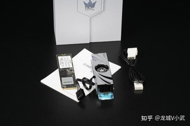 衆所周知PCIe 5.0既有強悍的性能加持,功耗也不可小覷,附件中單獨配有單獨的散熱馬甲,電鍍銀的外殼顯得未來感十足,外殼下是大面積的純銅散熱鰭片外加單獨小風扇,大大增強了散熱的性能。