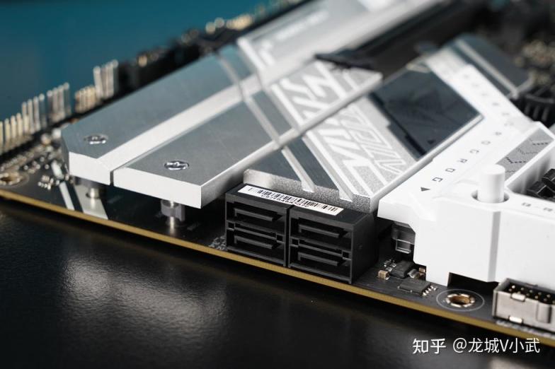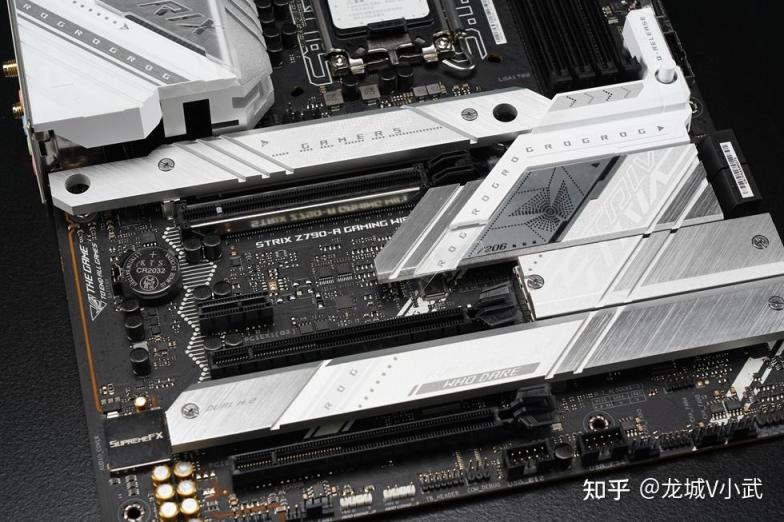華碩Z790吹雪D5主板配備了3根PCIe x16長插槽,第一根PCIe x16長插槽帶寬爲PCIe 5.0 x16直連CPU,同時做了金屬裝甲加固,剩下兩根爲PCIe 4.0 x16走南橋芯片組。提供了4條PCIe4.0×4規格的M.2 SSD插槽,其中主M.2 SSD插槽來自主板直出的PCIe通道,其餘三個M.2 SSD插槽則來自Z790芯片組,所有的M.2插槽都配備了厚重的鋁製散熱片和高導熱係數硅脂墊。M.2 SSD固定方式均採用M.2 Q-LATCH便捷卡扣設計,無需工具即可輕鬆拆裝M.2 SSD。