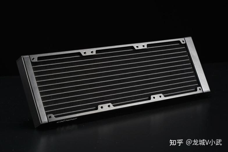 冷排尺寸爲:394x121x27mm,鰭片採用的是方波型折彎,相比常規冷排鰭片密度更大導熱效率更高。