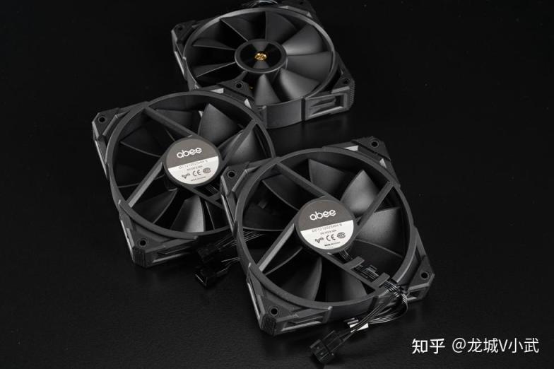 散熱器自帶了三枚abee自行開發的12025規格風扇,採用的是雙滾珠軸承,平均無故障時間是20萬小時,可以提供最大69.5CFM的風量與3.2mm水柱的風壓,支持PWM調速,可提供500RPM至1800RPM±10%的調速範圍,最大噪音爲32.8分貝,在效能與靜音之間有較好的平衡。