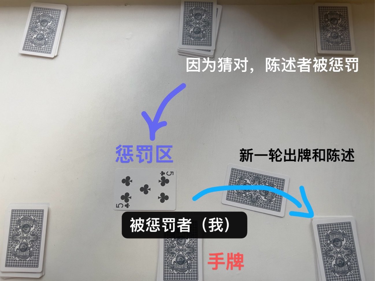 我点了点头。“惩罚就是,这张牌要明牌放在我面前的惩罚区,作为可以公开确认的惩罚牌,这一轮出牌就结束了。接下来,接受惩罚的玩家再从手中暗扣一张牌,交给一位玩家并陈述,开始新一轮。”