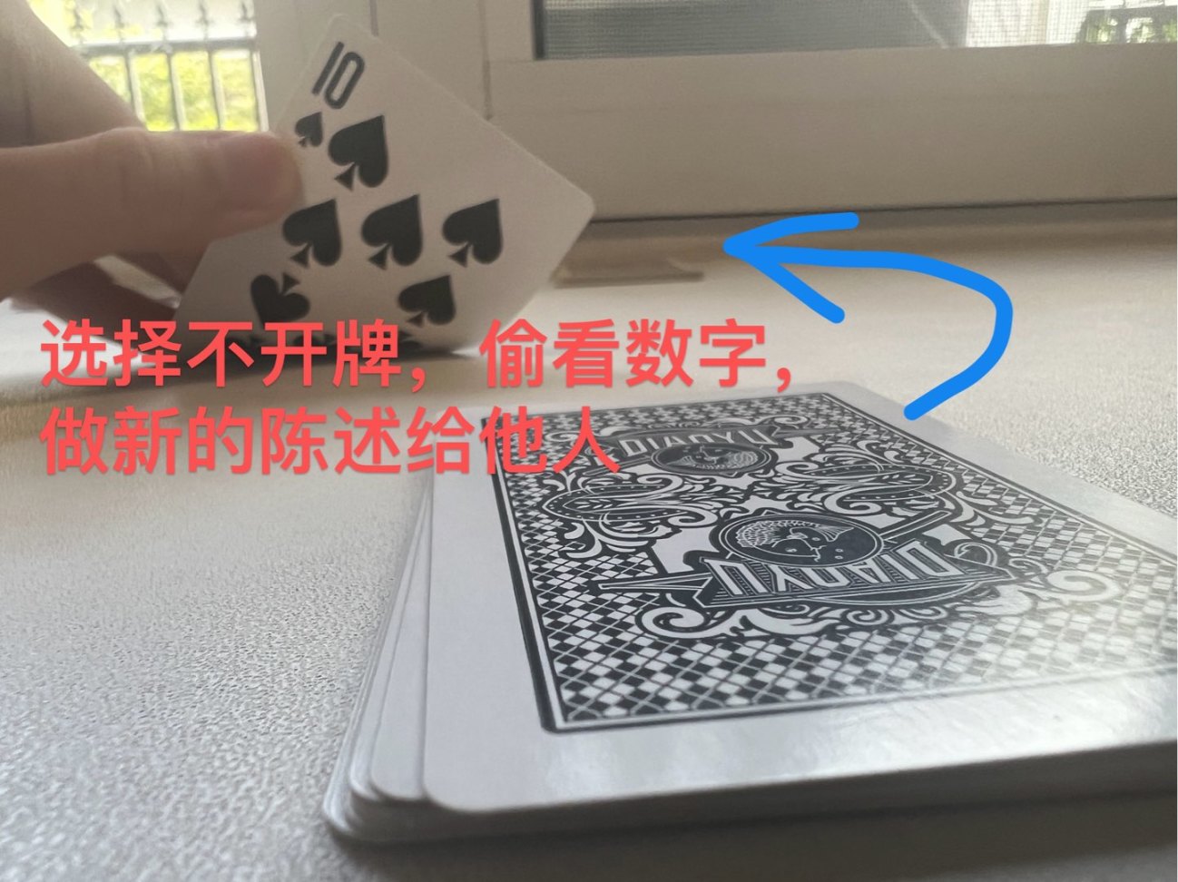 “此时你有两种行动可选,必须执行一种。”我拍了拍舍友的肩,说:“其一,你可以开这张牌。但开牌前,你要先说明是否相信陈述。无论是否相信,只要你猜的正确,那就是出牌的我受到惩罚。如果猜错,开牌的你受到惩罚。”