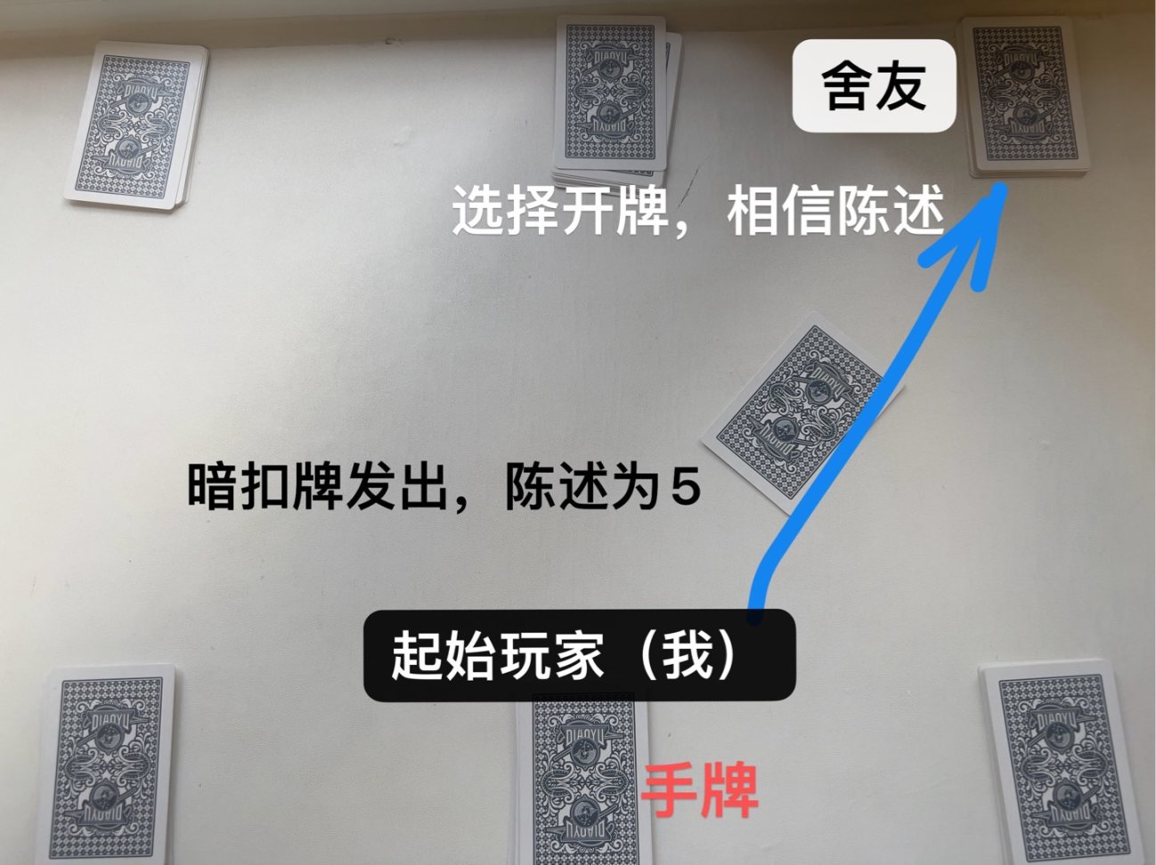 我从手牌中取出一张牌,扣在桌子上。“开始时我们决定一位玩家开始游戏,这个玩家需要从手牌中暗扣一张牌,并任选一位玩家,把牌放在ta面前,然后对这张牌做一个数字的陈述。”我将这张牌放在过生日的舍友面前,说:“这张牌是5。但是我说的话可能是真的,也可能在骗你。”
