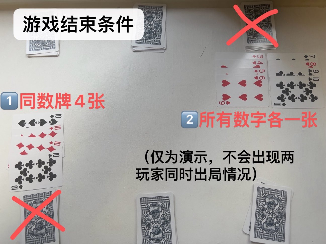 “最后是游戏的结束条件。首先,我们面前的惩罚区都是公开的,一旦有玩家在惩罚区有了同一个数字的牌共4张,或者每种牌都至少有了1张,游戏立刻结束,这位玩家失败。其次,如果前面的条件尚未达到,但有一位玩家已经没有牌可出了,游戏也结束,拥有惩罚牌最多的玩家失败。”
