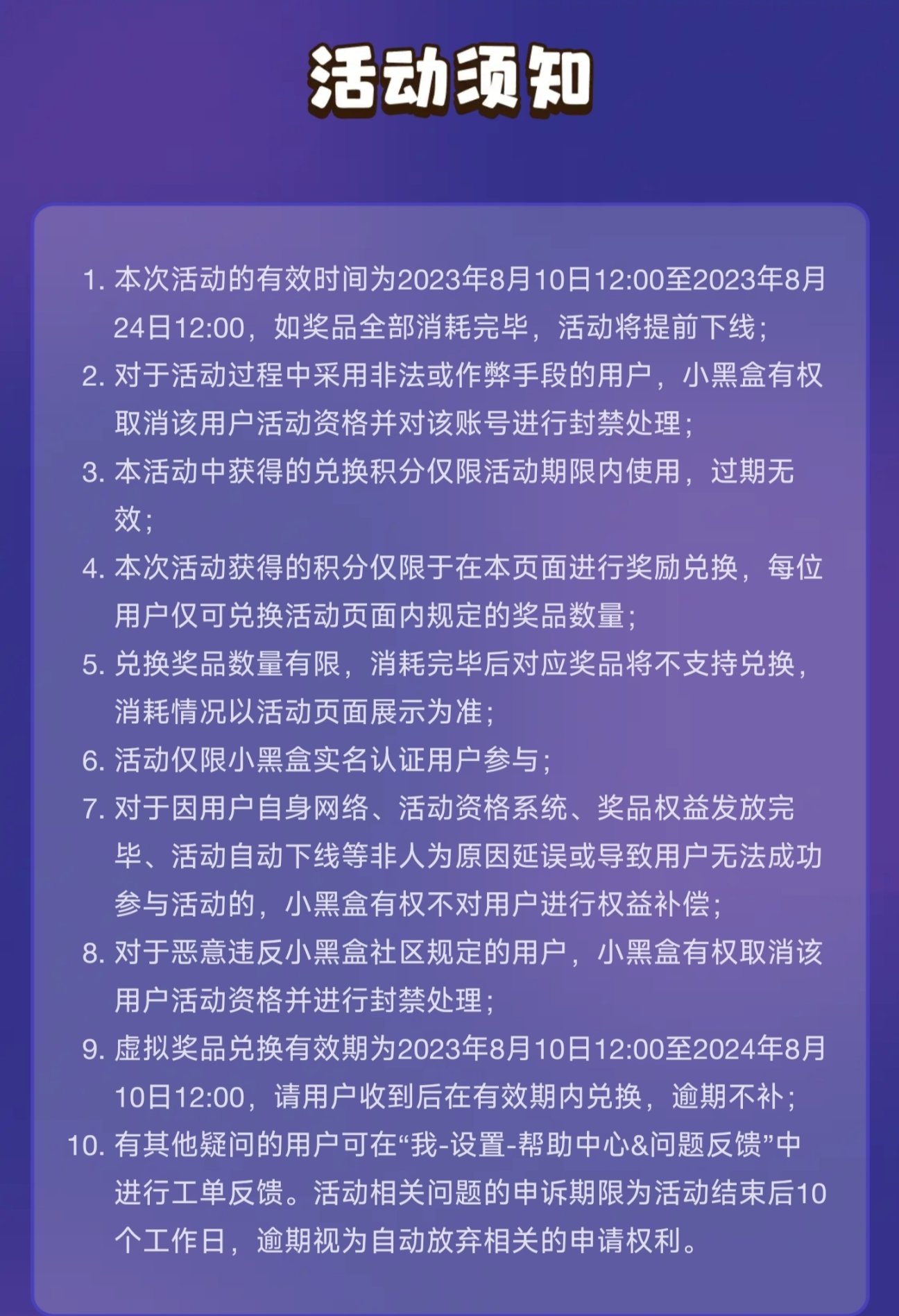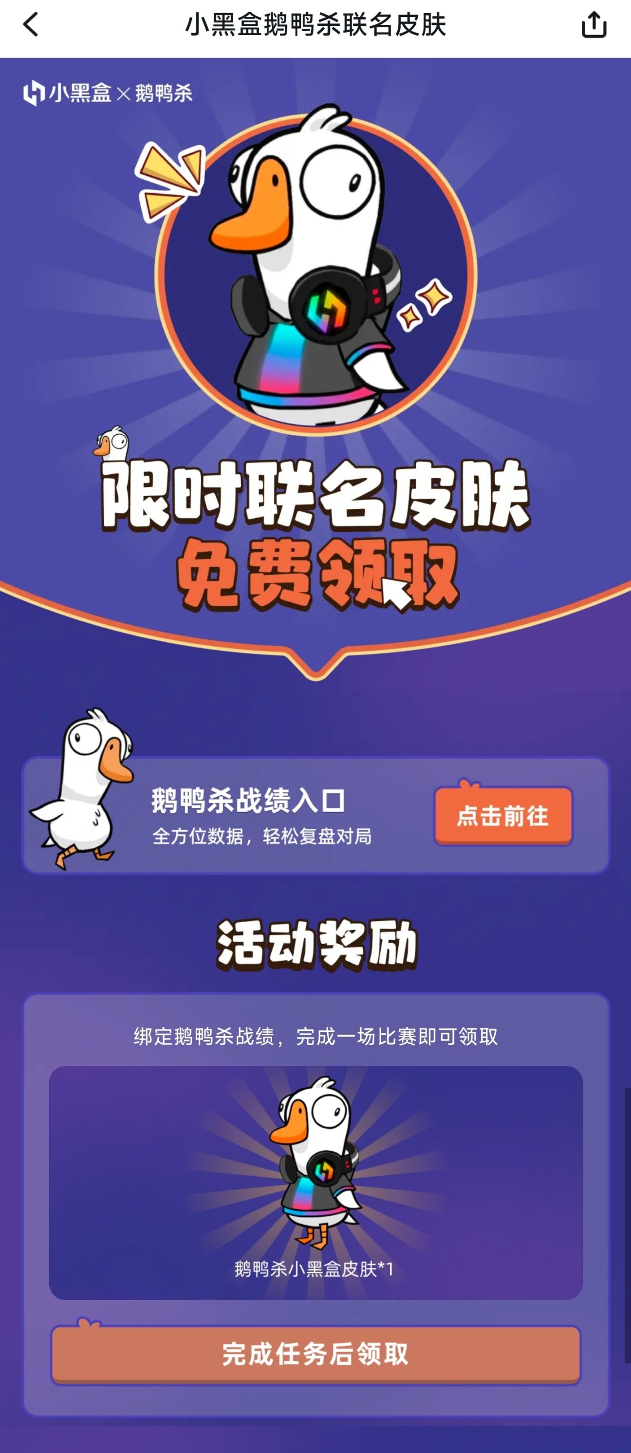 3.六周年下滑有个小黑盒鹅鸭杀联名皮肤活动,绑定战绩玩一局就🉐,规则须知说是数量有限,活动时间8.10 12:00-8.24 12:00,兑换截止到2024.8.10 24:00