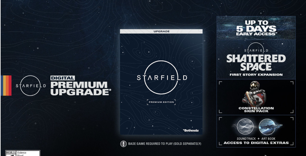 《星空》數字升級包除了遊戲本體外,還包括Shattered Space Story擴展包、羣星組織皮膚包(包含二分點激光步槍、宇航服、頭盔和飛行揹包)、《星空》數字畫集與原聲帶以及提前至多5天的搶先體驗權益。