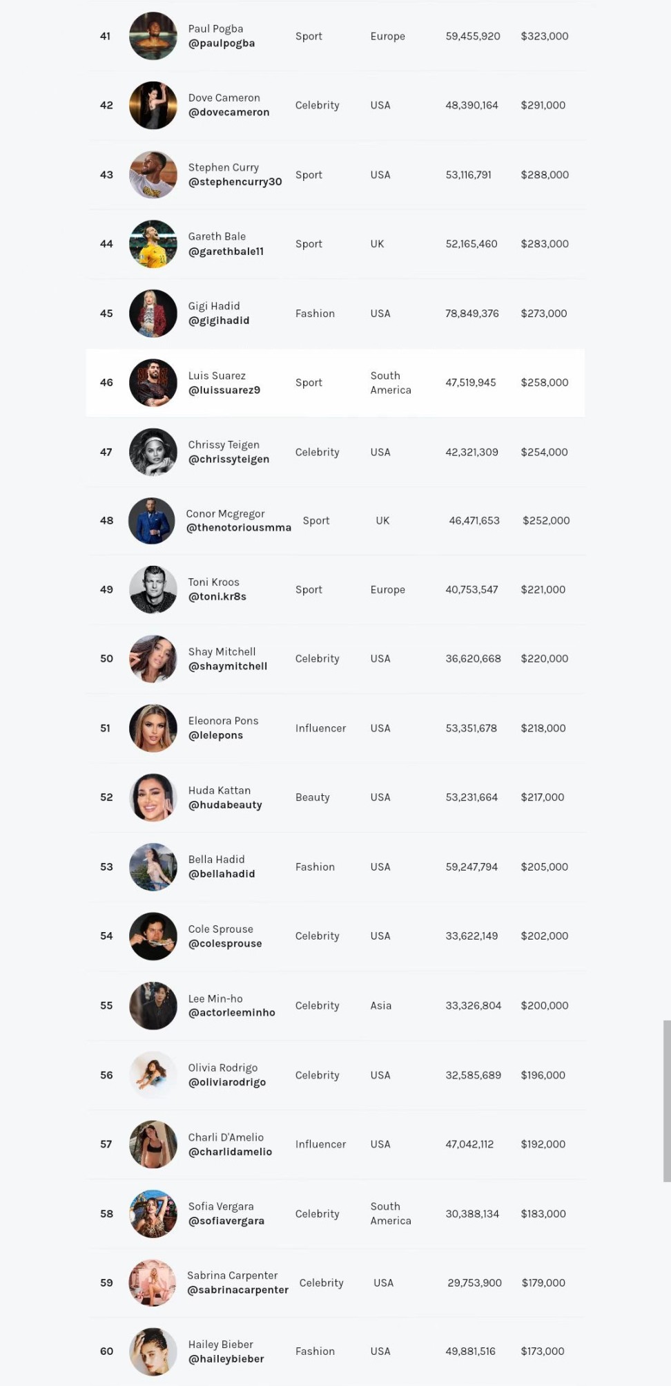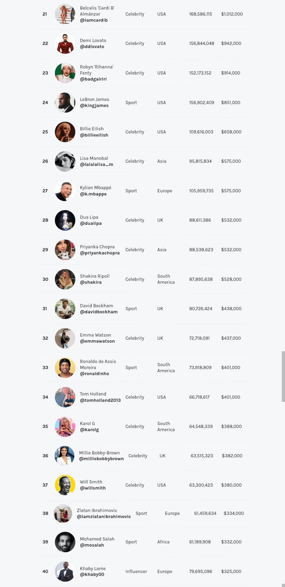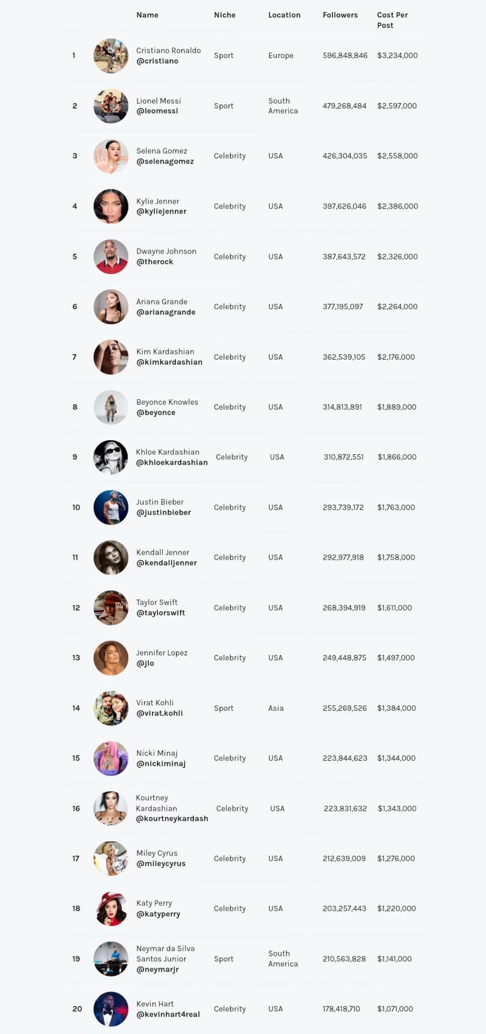 在本次排行中,居於首位的依然是C羅,以5.96億粉絲,以及323萬美元的單條貼文廣告費用獨佔鰲頭。